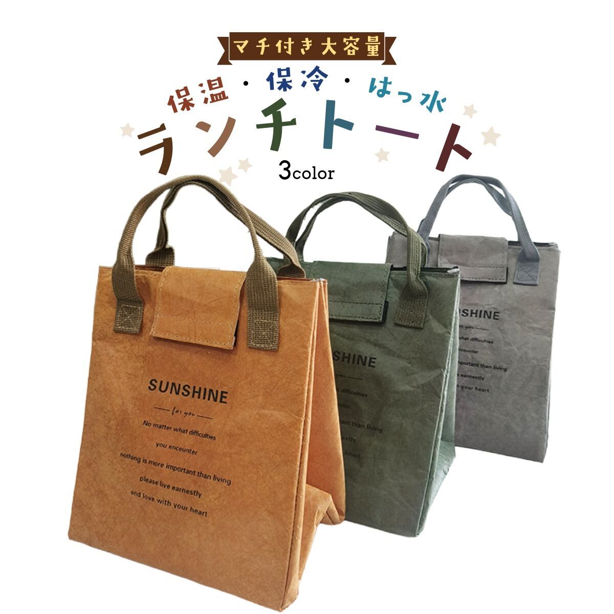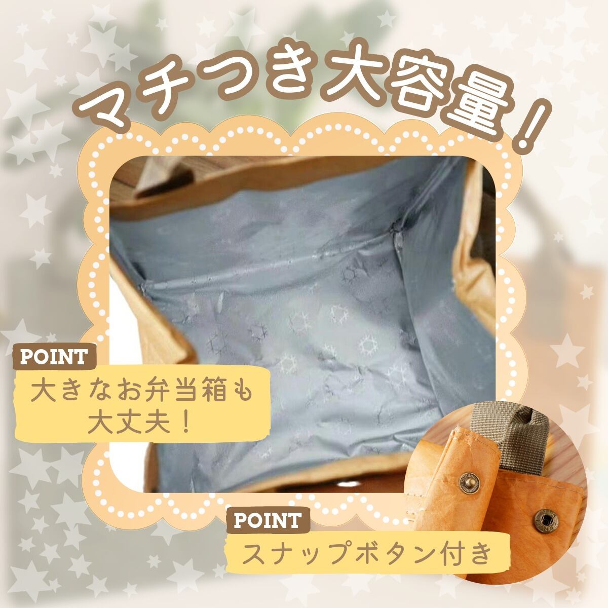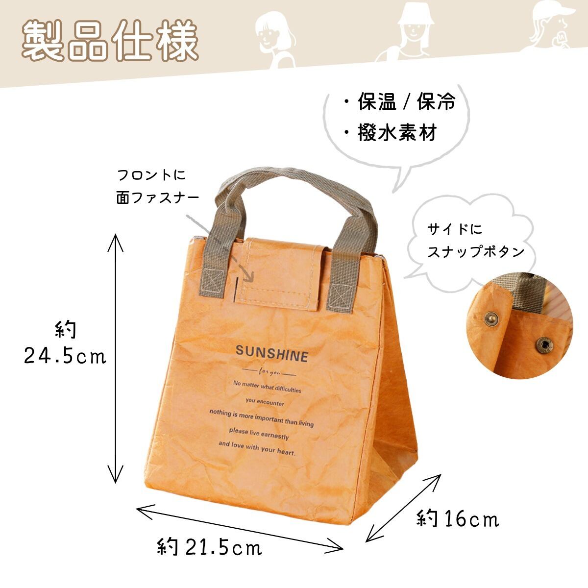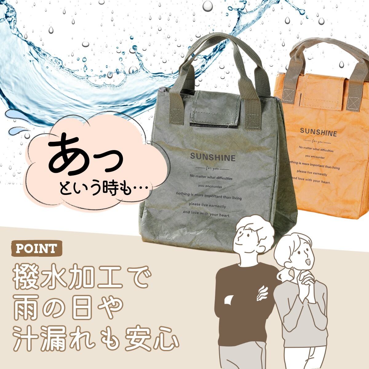 大きなマチ付きで、保冷保温仕様になっているので、お弁当だけでなく飲み物も持ち運べます。