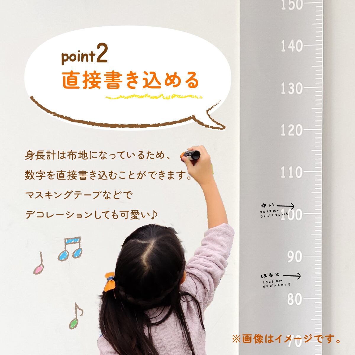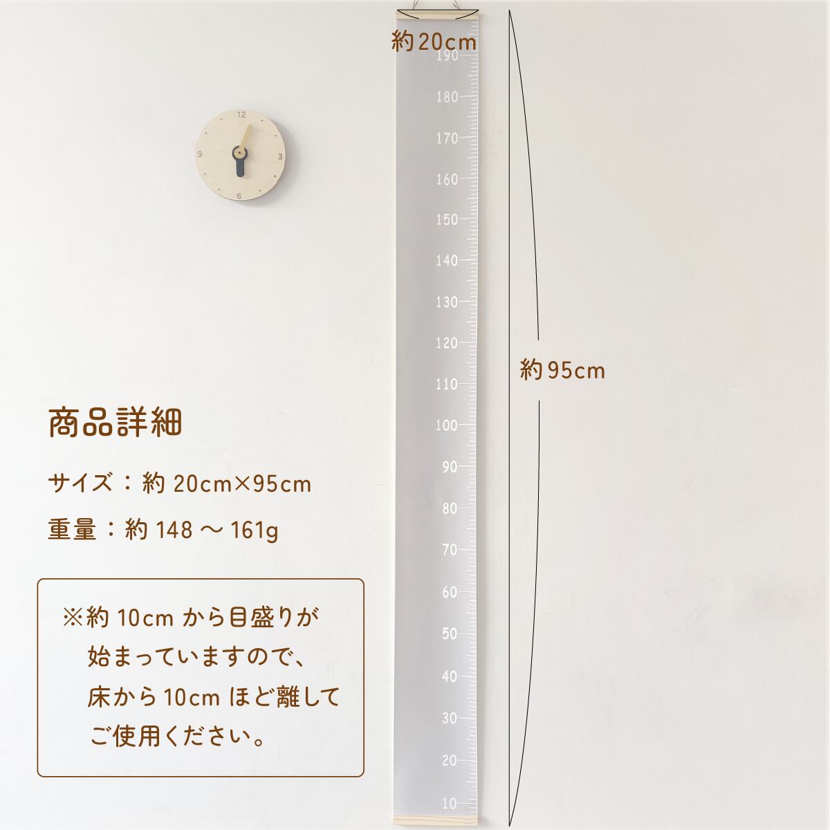 ・横幅20cmの軽量で持ち運びしやすく置きやすいので好きな場所にかけて成長を記録できます。