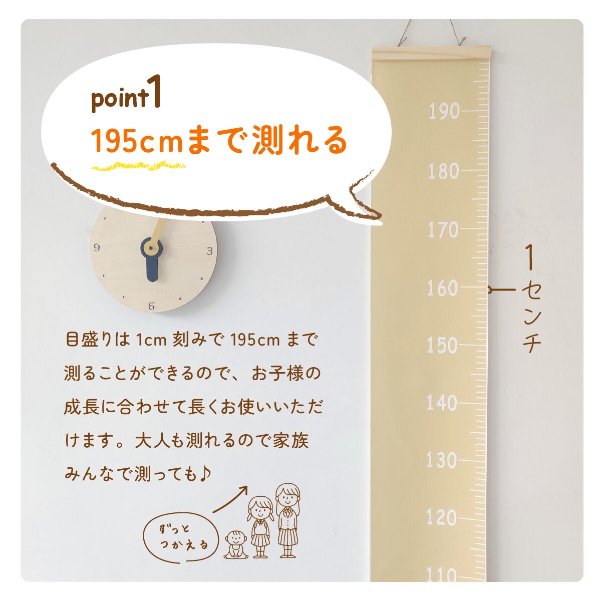 ・計測できるメモリの長さは195cmまであるのでお子様の成長に合わせて長くご使用いただけます。
