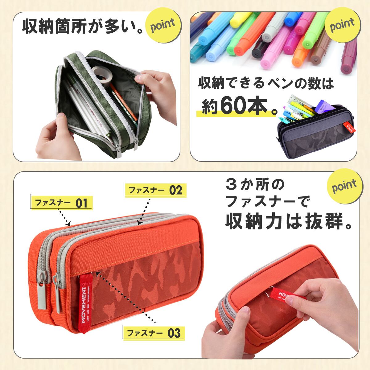 このペンケースはペンや鉛筆などが約60本入れることができます。